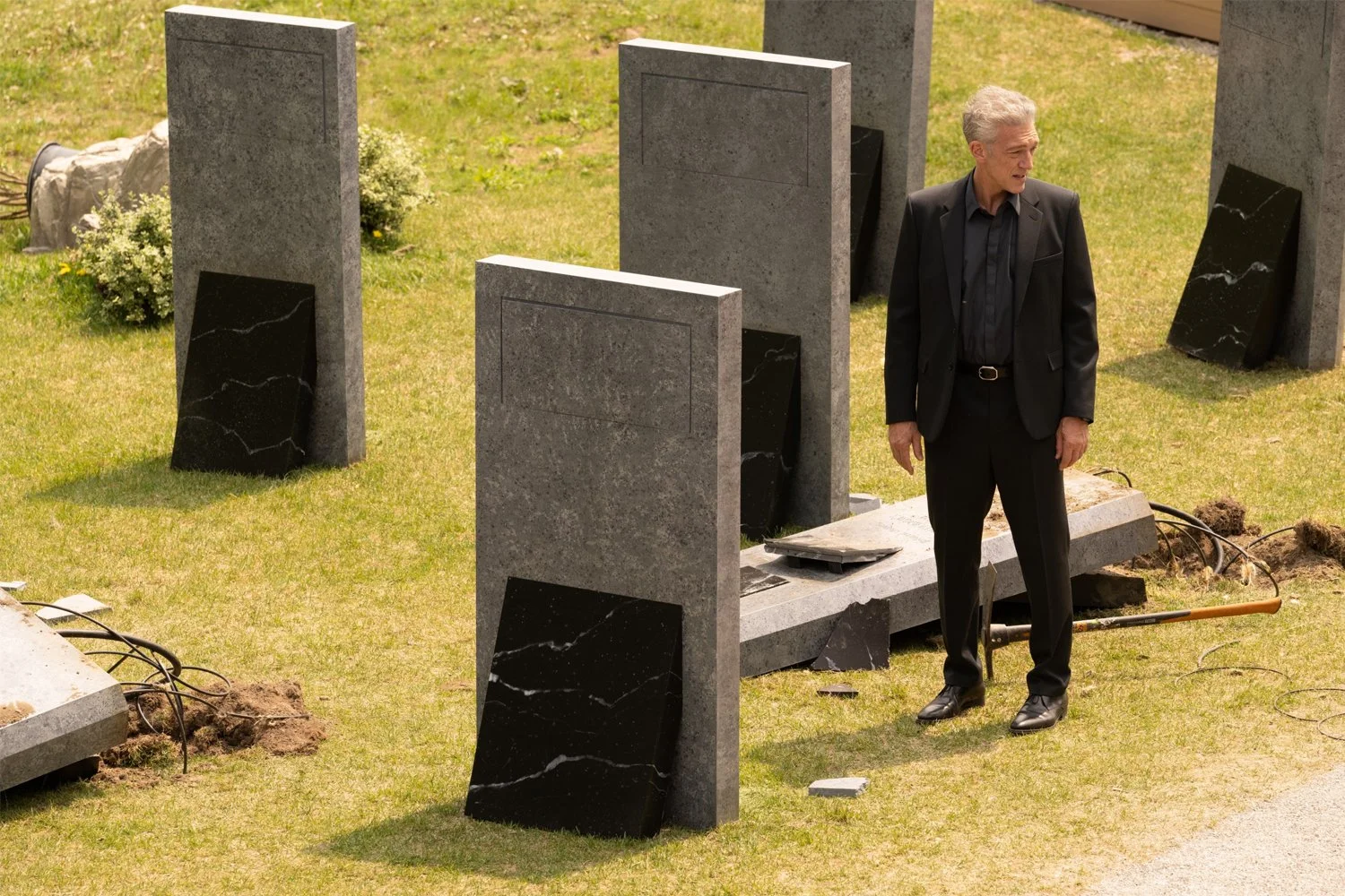 The mononymous Karsh (Vincent Cassel), sporting cosplay of Cronenberg himself with a minimal wardrobe, sunglasses, and a silver coif, is a self-described futurist and “producer of industrial videos.” Recently, he has funneled his wealth into an ambitious new startup called GraveTech, a private cemetery that houses his latest innovation: the titular “shrouds.” Comprised of sinister-looking sheets of tech fabric that envelops cadavers in fiber-optics, Karsh’s invention allows loved ones — who have the means — to surveil the dead as they decompose in the ground. “It’s pretty definitely a fake,” retorts Karsh when a visitor alludes to the Shroud of Turin. “My shrouds are not fake.” He mentions this because he would know: his dead wife, Becca (Diane Kruger), is in one.